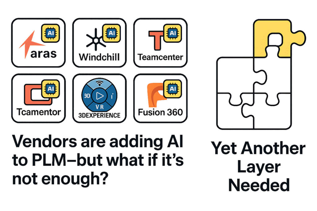 SaaS PLM platforms like Aras Innovator SaaS, Windchill+, Teamcenter X, 3DEXPERIENCE, and Fusion 360 Manage are embedding AI for part search, documentation summarization, or metadata classification. Useful—but limited.