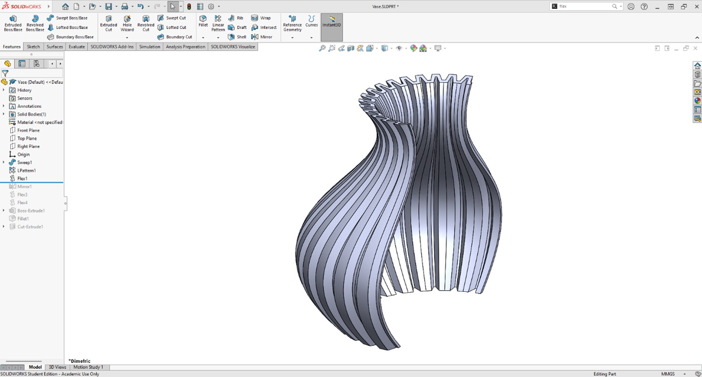 In this example, we will create a decorative vase using pattern, bending, stretching, and twisting techniques. The process demonstrates how the Flex and Mirror features in SOLIDWORKS can transform a simple pattern into a complex 3D shape.