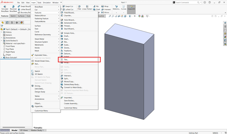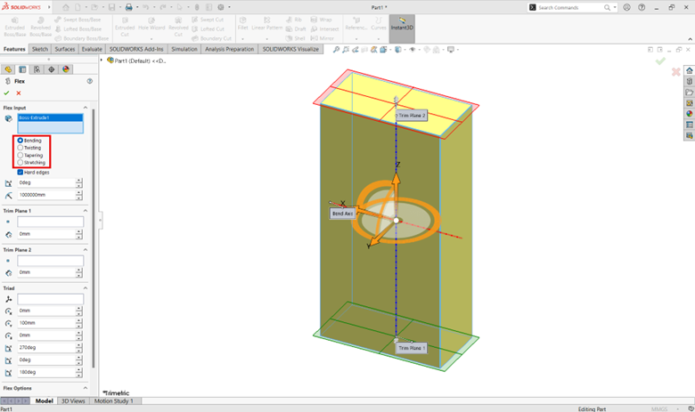 The Flex feature in SOLIDWORKS is a direct modeling tool that lets you deform solid or surface bodies in four ways: