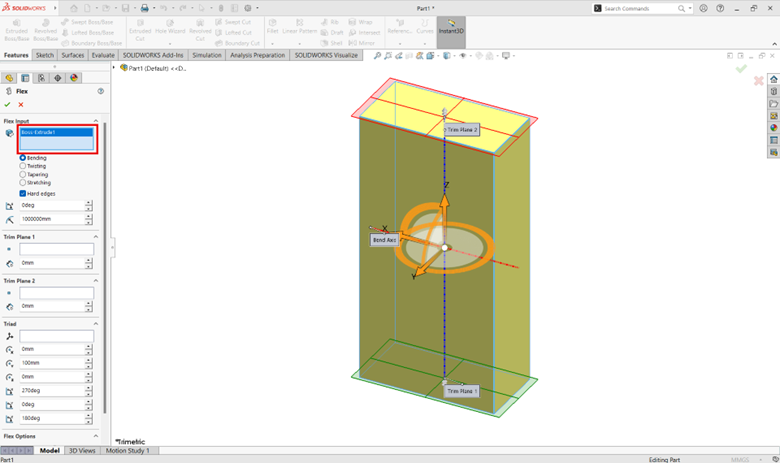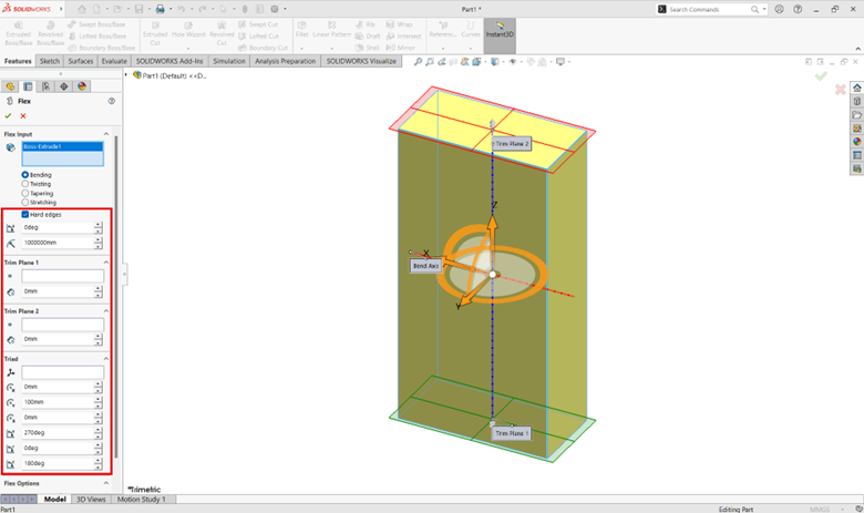- Set Trim Plane 1 = 0 and Trim Plane 2 = 0, so the entire part twists.