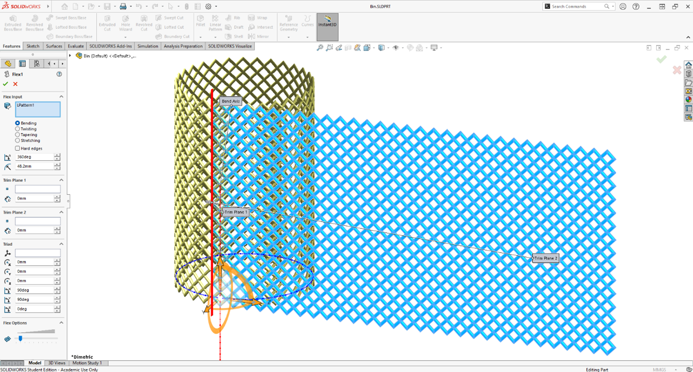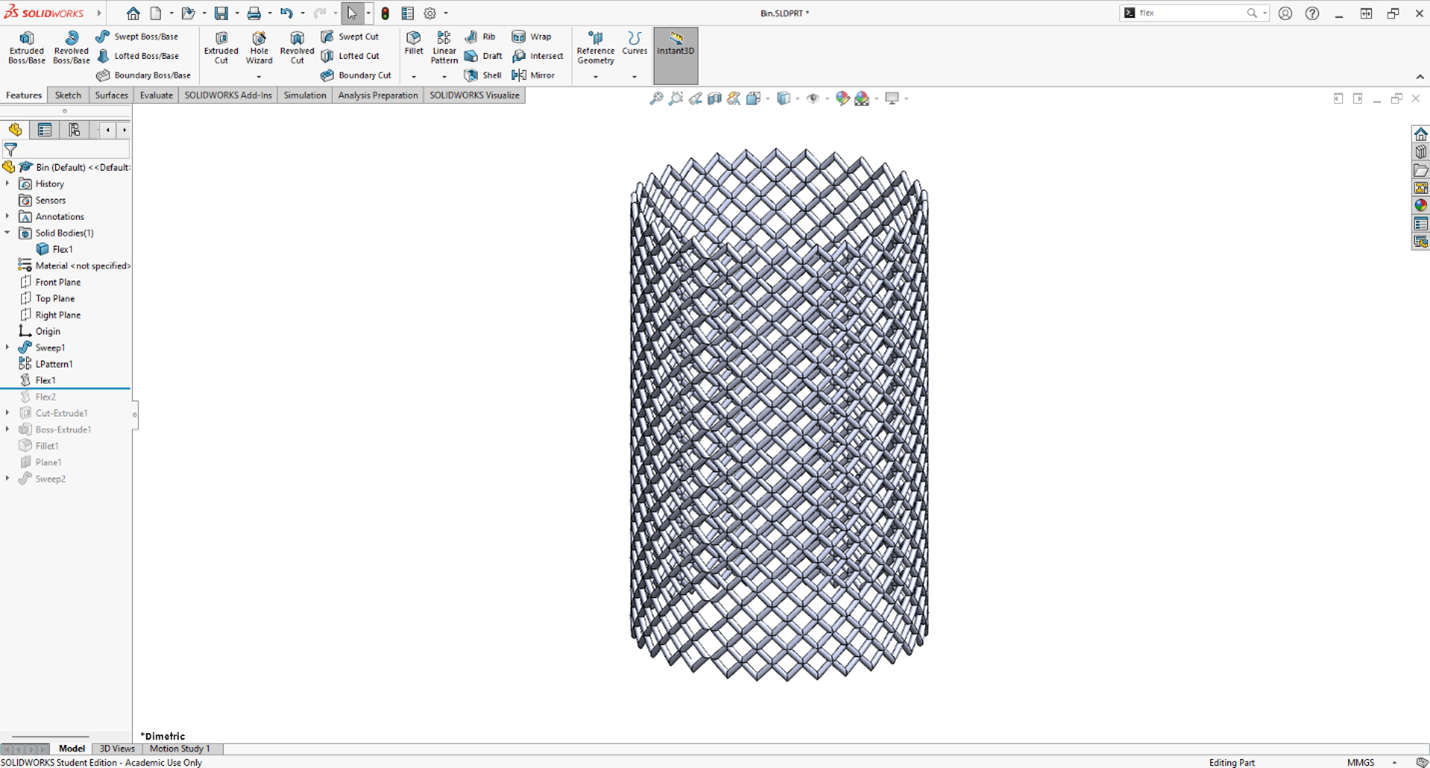 In this example, we will create a simple bin by transforming a flat mesh into a 3D cylindrical shape. The workflow demonstrates how to use SOLIDWORKS’ Flex feature to bend, taper, and finalize a part with a base and rim.