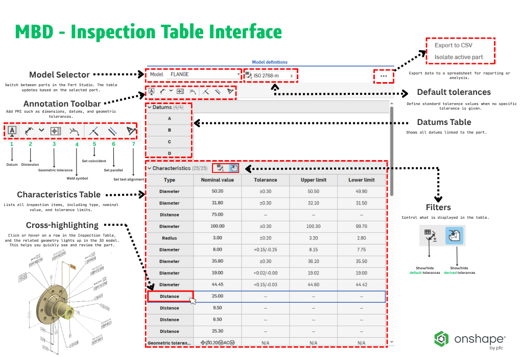 The Inspection Table is a key part of the Onshape MBD workflow. It shows all PMI in a clear and organized way.