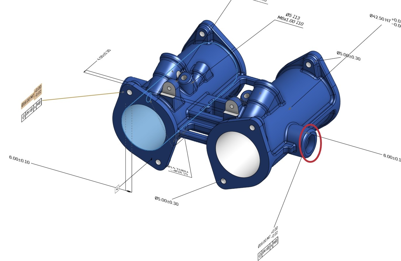 Hello @RIDVAN, I set Datum A (flange surface) for the shaft bores. For machine zero (Datum B), the outer surfaces marked in red are too rough. Is the tagged main bore the ideal reference for fixturing? Can you confirm and add Datum B?